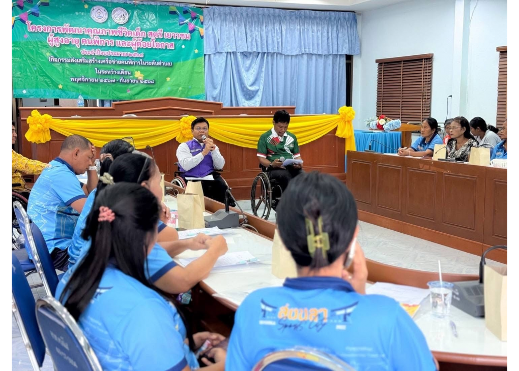 นายอนุวัฒน์ พรมสวัสดิ์ เลขานุการนายก อบจ.สงขลา เป็นประธานในพิธีเปิดกิจกรรมส่งเสริมสร้างเครือข่ายคนพิการในระดับตำบล ภายใต้โครงการพัฒนาคุณภาพชีวิตเด็ก สตรี เยาวชน ผู้สูงอายุ ผู้พิการและผู้ด้อยโอกาส ประจำปีงบประมาณ พ.ศ. 2568